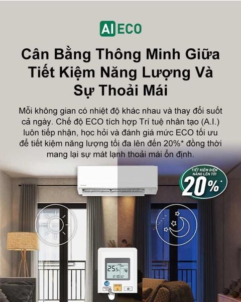 Công nghệ Inverter giúp duy trì nhiệt độ ổn định, hạn chế dao động công suất, giảm tiêu thụ điện năng đáng kể so với điều hòa không Inverter. Khi kích hoạt AI ECO, hệ thống tự động phân tích điều kiện phòng (nhiệt độ, độ ẩm, mức độ sử dụng) và điều chỉnh mức hoạt động phù hợp nhất, tối ưu hóa điện năng mà vẫn giữ hiệu quả làm lạnh cao. Mức tiêu thụ điện khoảng 1.8 kW/h đạt nhãn năng lượng 5 sao, giúp gia đình tiết kiệm chi phí điện hàng tháng mà vẫn đảm bảo không gian luôn mát mẻ, thoải mái. Đây là giải pháp tiết kiệm điện hiệu quả, phù hợp với nhu cầu sử dụng lâu dài.