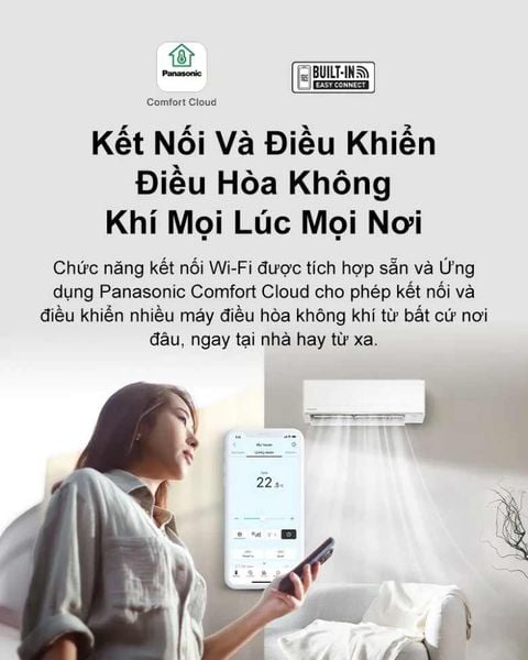 Tích hợp Wi-Fi cho phép điều khiển máy qua ứng dụng Panasonic Comfort Cloud trên điện thoại. Bạn có thể bật/tắt, điều chỉnh nhiệt độ, hẹn giờ hoặc kiểm tra trạng thái máy từ bất kỳ đâu – rất tiện lợi khi ra ngoài mà quên tắt máy hoặc muốn làm mát phòng trước khi về nhà. Tính năng này mang lại sự tiện nghi hiện đại, phù hợp với lối sống thông minh ngày nay, giúp bạn quản lý điều hòa dễ dàng mọi lúc mọi nơi.