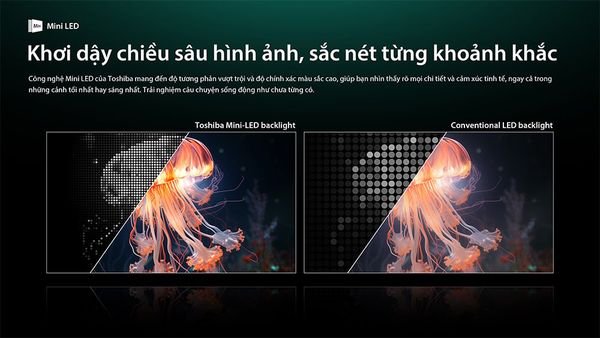 Mini LED là công nghệ đèn nền đột phá với hàng ngàn bóng đèn LED siêu nhỏ được sắp xếp dày đặc. Điều này cho phép tivi Toshiba 65Z770RP kiểm soát độ sáng và độ tối của từng vùng trên màn hình một cách chính xác. Kết quả là hình ảnh có độ tương phản cao, màu đen sâu hơn và màu trắng sáng hơn, mang lại cảm giác chân thực và sống động trong từng cảnh phim.