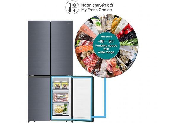 Hisense hiểu rằng mỗi gia đình có nhu cầu bảo quản thực phẩm khác nhau. Vì vậy, ngăn My Fresh Choice được thiết kế để chuyển đổi 24 mức nhiệt độ linh hoạt từ -18°C đến +5°C, giúp bạn dễ dàng tùy chỉnh không gian lưu trữ. Từ làm ngăn đông mềm cho thịt cá đến ngăn mát phụ bảo quản đồ tươi, mọi nhu cầu đều được đáp ứng chỉ với một nút chạm.