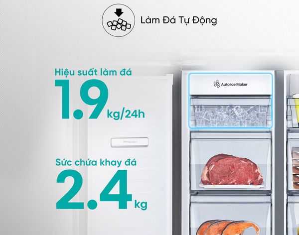 Không còn mất thời gian chờ đợi hay thao tác thủ công, tủ lạnh Hisense RQ630N4EBUI3 tích hợp hệ thống làm đá tự động, có thể tạo ra hơn 2kg đá mỗi ngày. Khi khay đá đầy, hệ thống sẽ tự động ngừng hoạt động để tiết kiệm năng lượng và đảm bảo an toàn.