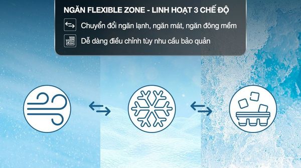 Đặc biệt, tủ có ngăn Flexible Zone linh hoạt với 3 chế độ nhiệt độ tùy chỉnh theo nhu cầu bảo quản: