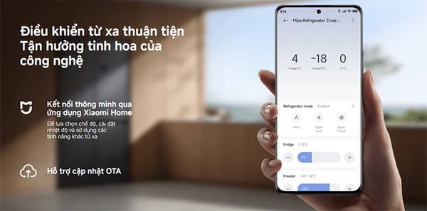 Tủ lạnh Xiaomi Mijia Multidoor 510 lít còn hỗ trợ điều khiển từ xa qua ứng dụng Xiaomi Home. Chỉ cần cài đặt ứng dụng trên điện thoại, bạn có thể dễ dàng theo dõi và kiểm soát các chế độ làm lạnh, nhiệt độ và nhận thông báo về tình trạng của tủ lạnh, mang đến sự tiện lợi và chủ động trong việc quản lý thực phẩm.